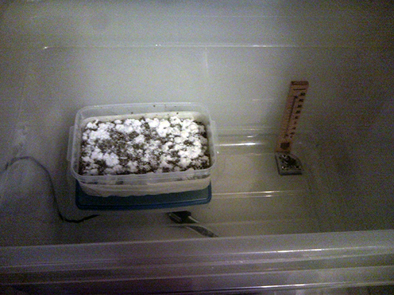 Nemoj da prskas po supstratu nego samo po kontejneru , da bude znojav. stavi posudu sa mlakom vodom da bude vlaznost veca. Ako ti je previse suvo unutra nece nista krenuti.
