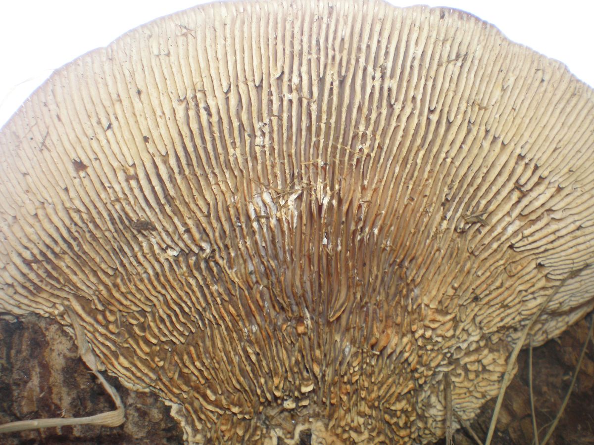 Izobličeni Hydnum repandum ako je rastao na tlu, možda Hydnellum vrsta ako je rastao na trulom drvu. Ali puno vjerojatnije Hydnum (prosenjak), napravi presjek da vidiš da li je meso mekano ili drvenasto.